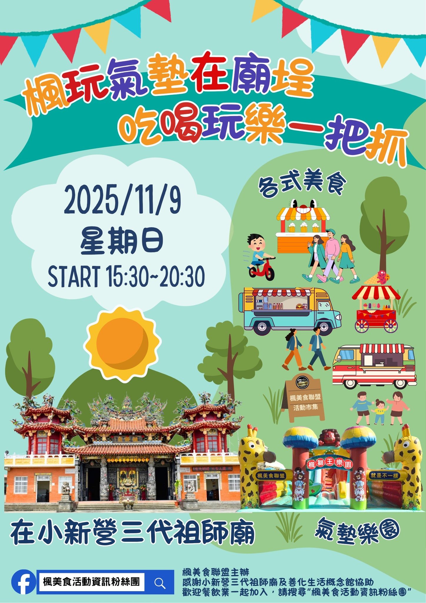 睽違數月,台南善化小新營將於11月9日(星期日)下午3點30分至晚間8點30分,在小新營三代祖師廟(台南市善化區小新里97號)舉辦「秋日派對」,讓民眾在涼爽的秋日午後,享受充滿歡笑與美食的休閒時光。