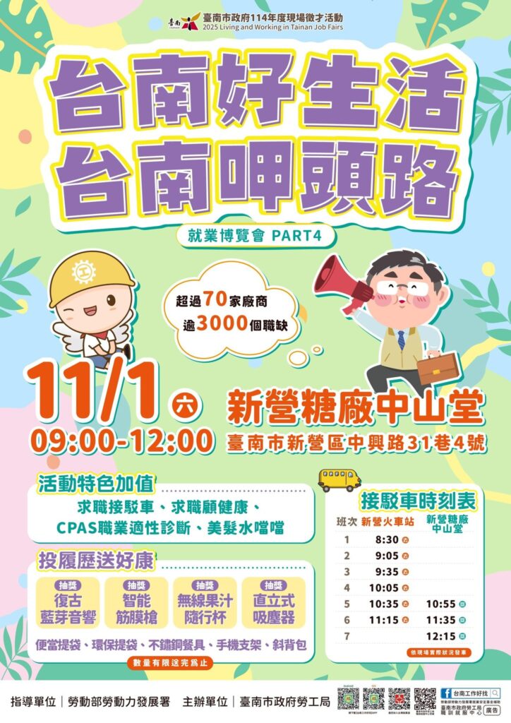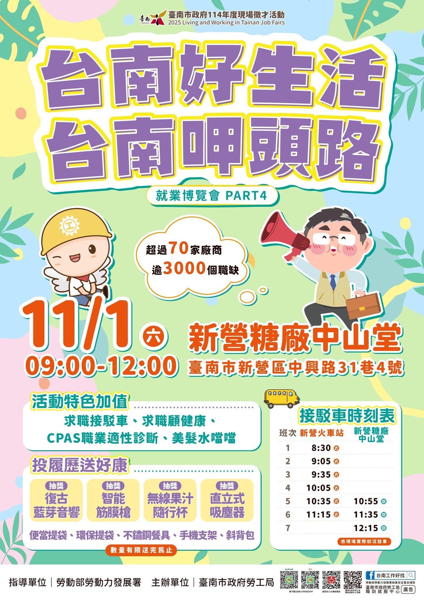 為協助市民朋友順利就業,台南市政府將於2025年11月1日(週六)上午9時至12時,在新營區新營糖廠中山堂舉辦「台南好生活 台南呷頭路」第4場大型就業博覽會。