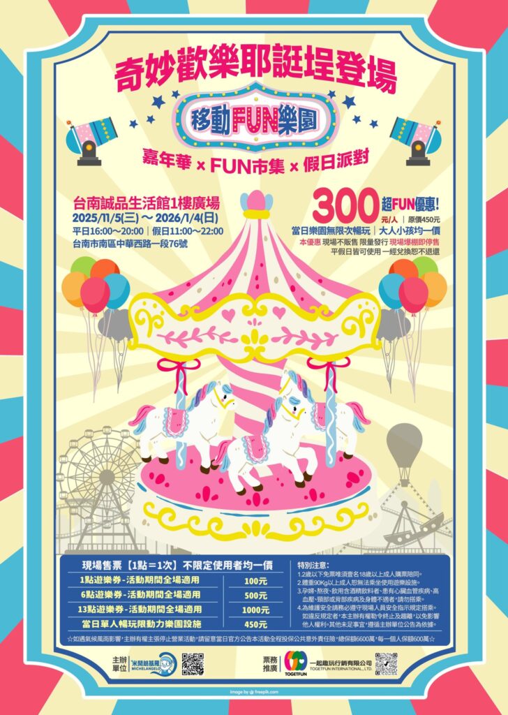 迎接2025聖誕及2026新年,台南誠品生活館將於2025年11月5日至2026年1月4日,在1樓廣場戶外打造「奇妙歡樂耶誕埕」,結合遊樂設施及市集,為台南民眾帶來充滿歡樂的節慶氛圍。