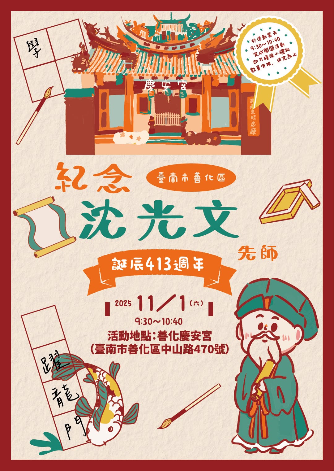 台南善化慶安宮將於114年11月1日舉辦沈光文先師413週年祭祀儀式