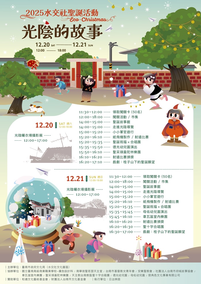想感受不一樣的聖誕節嗎?台南市政府文化局將於12月20日(六)至21日(日)在水交社文化園區舉辦「光陰的故事」聖誕活動,帶領民眾一同走進充滿懷舊氛圍的眷村聖誕。活動免費入場,內容豐富多元,包含聖誕市集、眷村導覽、沉浸式劇場、以及小朋友最期待的「小小空軍」系列活動,歡迎全家大小一同前來,感受濃濃的眷村聖誕溫度。