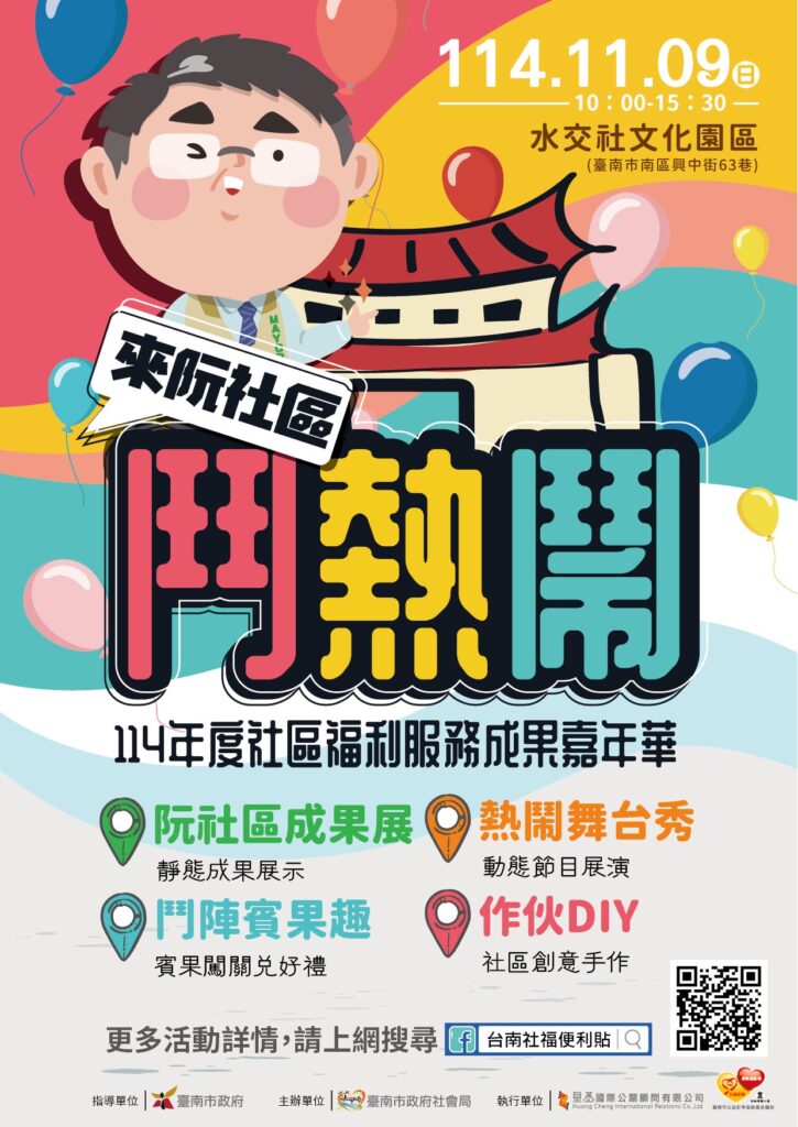 臺南在地ㄟ鄉親注意啦!一年一度的社區福利服務成果嘉年華,今年將於114年11月9日(星期日)上午10點至下午3點30分,在充滿懷舊氛圍的水交社文化園區熱鬧登場。這次嘉年華以「來阮社區鬥熱鬧」為主題,匯集了30個社區與12個公益單位的精彩成果,要用尚讚的臺南滋味,展現咱社區濃濃的人情味,邀請所有市民朋友作伙來逗熱鬧!